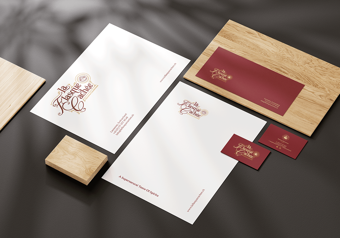 Our common vision was to create a mysterious logotype with attention to detail. Moreover, we made a logo icon with the flasque for further applications such as promotional materials, while the printed applications use a combination of techniques to elevate the visual result.